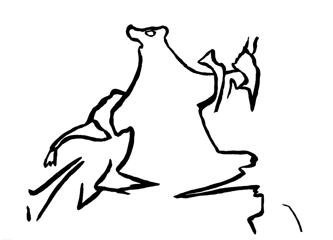[1] There is a reason why the example of a rat-human was intentionally brought up. In my 2021 video work Arbitrary Radius Circle, I explored the relationship between Skinner box lab rats and machine learning, and referenced a scene from a Japanese animation (World Folktales: The Man Who Lost His Shadow 世界昔語 影をなくした男, 1976) that introduces a Korean folktale. In this story, a rat eats a man’s fingernail, becomes his double, and the man, having lost his shadow, is treated as a monster and driven out of his home. In the end, he defeats the rat-human-double with the help of a Buddhist monk. The story of transformation (or shapeshifting) gives concrete body-form to the idea of anthropomorphism – and similar tales can be found across many cultures. The image is a drawing based on the video still.
