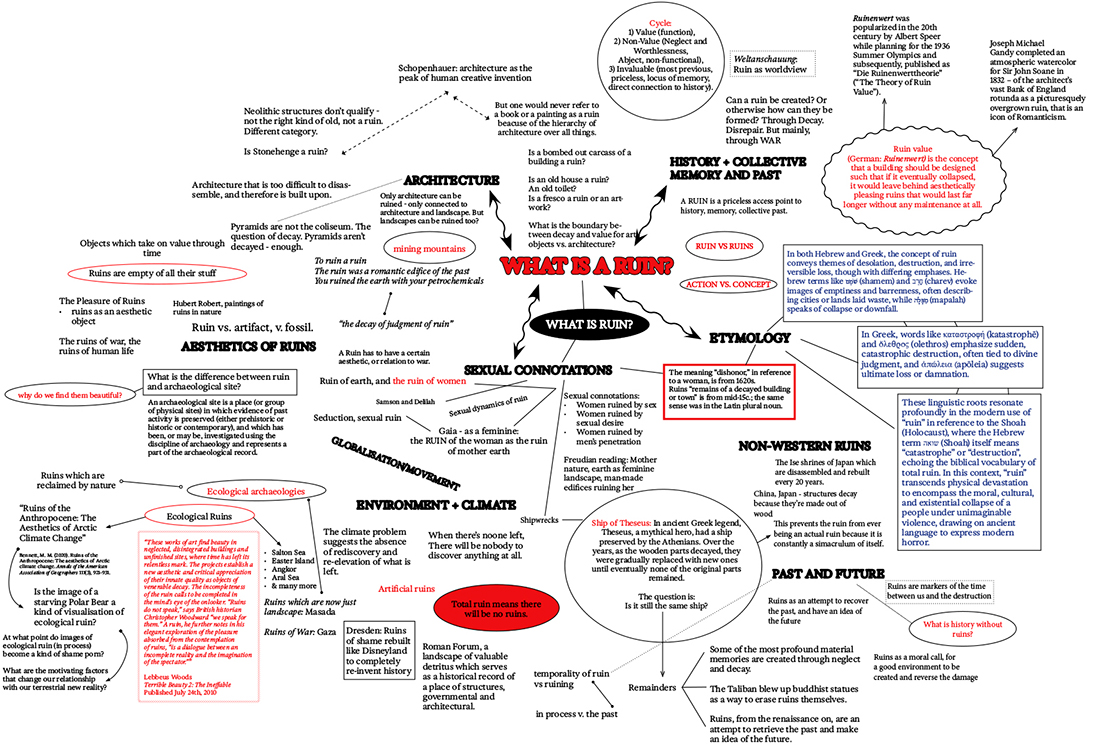 Ruins occupy a space at the intersection of architecture, memory, and time: representing both the physical remnants and the abstract process of decay. In the context of the Anthropocene, the idea of “ecological ruins” reframes this concept, as environments and structures are gradually abandoned or erased by environmental forces. The term ruin functions both as a noun and a verb, denoting simultaneously the material aftermath of destruction and the ongoing process of deterioration. This duality underscores the conceptual tension between the static presence of what remains and the dynamic, temporal unfolding of loss itself, especially as the boundaries between natural decay and anthropogenic ruin become increasingly blurred. This mind map, in place of a traditional essay format, explores the vastness of ruin and ruins through fragmentary connections, references, and associations.