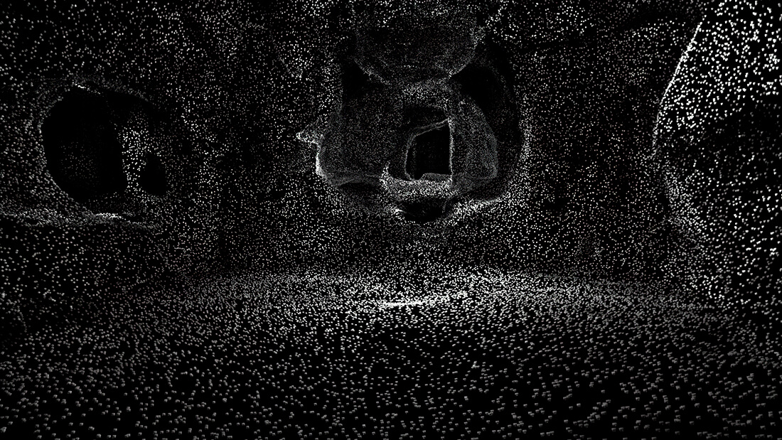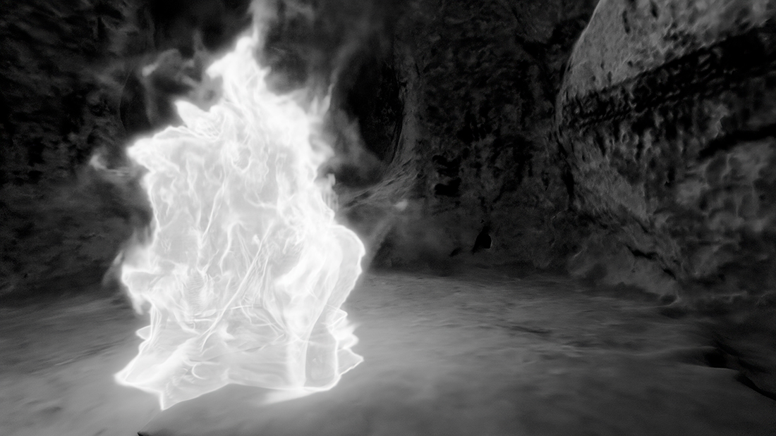 A Shroud Woven of Solar Threads is an immersive video that connects the ancient Iranian Sun worship of Mitra – which coincided with the climate crises 4200 years ago – with the contemporary concept of solar geoengineering. Combining 3D scans of the oldest surviving Mitra temple, a speculative model of Proto-Indo-Iranian (reconstructed using an LLM), and a gravitational model of the Sun, the entire film's world is a hyperrealistic model, underlining the position that we can only engage "Nature" as a modelled simulation to intervene in its process. Revolving around a subterranean ritual, the surface of the cavernous temple eventually disintegrates into a particle cloud as the ancient language morphs into a futuristic computer script suggesting a protocol for solar geoengineering. The soundtrack is generated exclusively from period sounds by modulating and synthesizing fire, human voice, solar radiation recordings, and the ancient ney instrument.